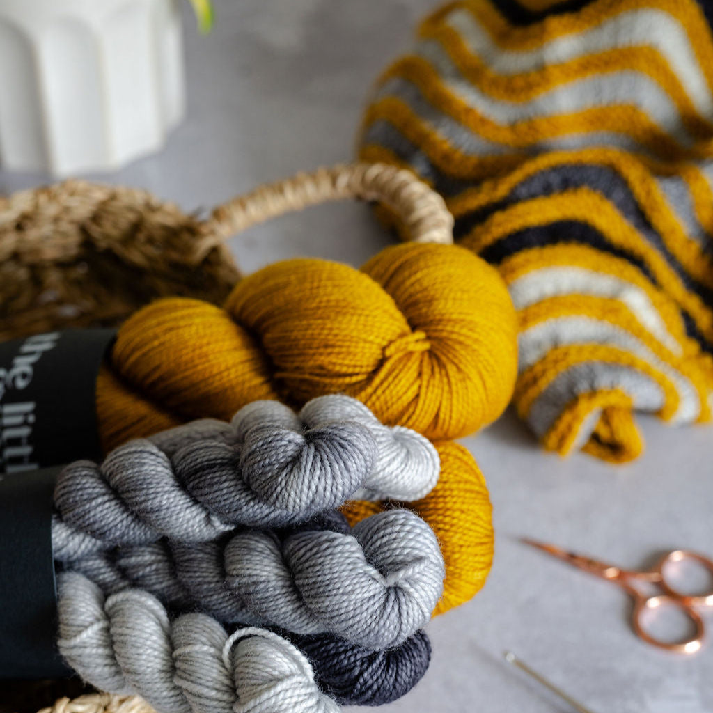 This kit includes 6x20g mini skeins in a grey fade and 150g of golden yellow for the main colour.